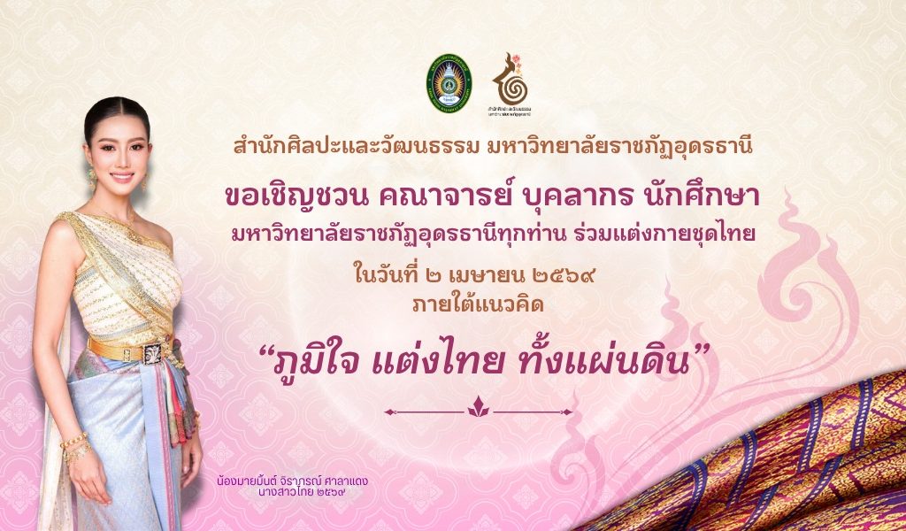สำนักศิลปะและวัฒนธรรม มหาวิทยาลัยราชภัฏอุดรธานี ขอเชิญชวน คณาจารย์ บุคลากร นักศึกษา มหาวิทยาลัยราชภัฏอุดรธานีทุกท่าน ร่วมแต่งกายชุดไทย ในวันที่ 2 เมษายน 2569 ภายใต้แนวคิด "ภูมิใจ แต่งไทย ทั้งแผ่นดิน"