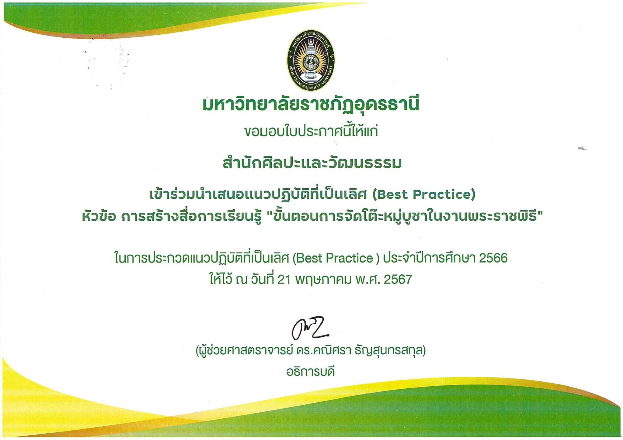สำนักศิลปะและวัฒนธรรมร่วมนำเสนอแนวปฏิบัติที่เป็นเลิศ (Best Practice) สำนักศิลปะและวัฒนธรรม เข้าร่วมนำเสนอแนวปฏิบัติที่เป็นเลิศ (Best Practice) หัวข้อ การสร้างสื่อการเรียนรู้ “ขั้นตอนการจัดโต๊ะหมู่บูชาในงานพระราชพิธี”ในการประกวดแนวปฏิบัติที่เป็นเลิศ (Best Practice ) ประจำปีการศึกษา 2566 ให้ไว้ ณ วันที่ 21 พฤษภาคม พ.ศ. 2567