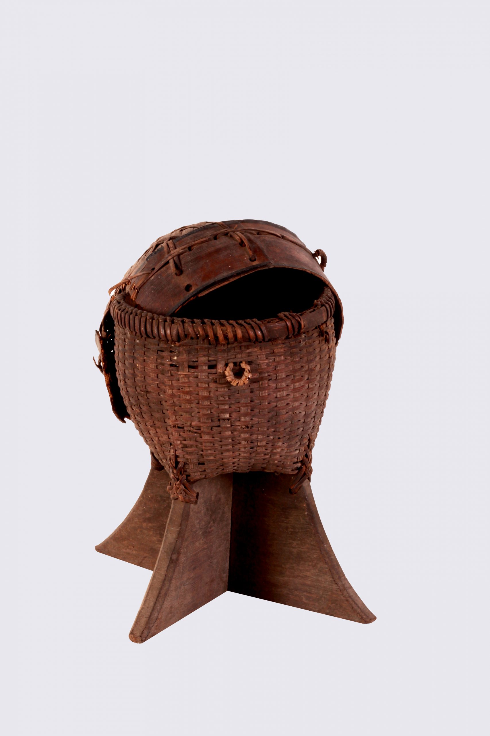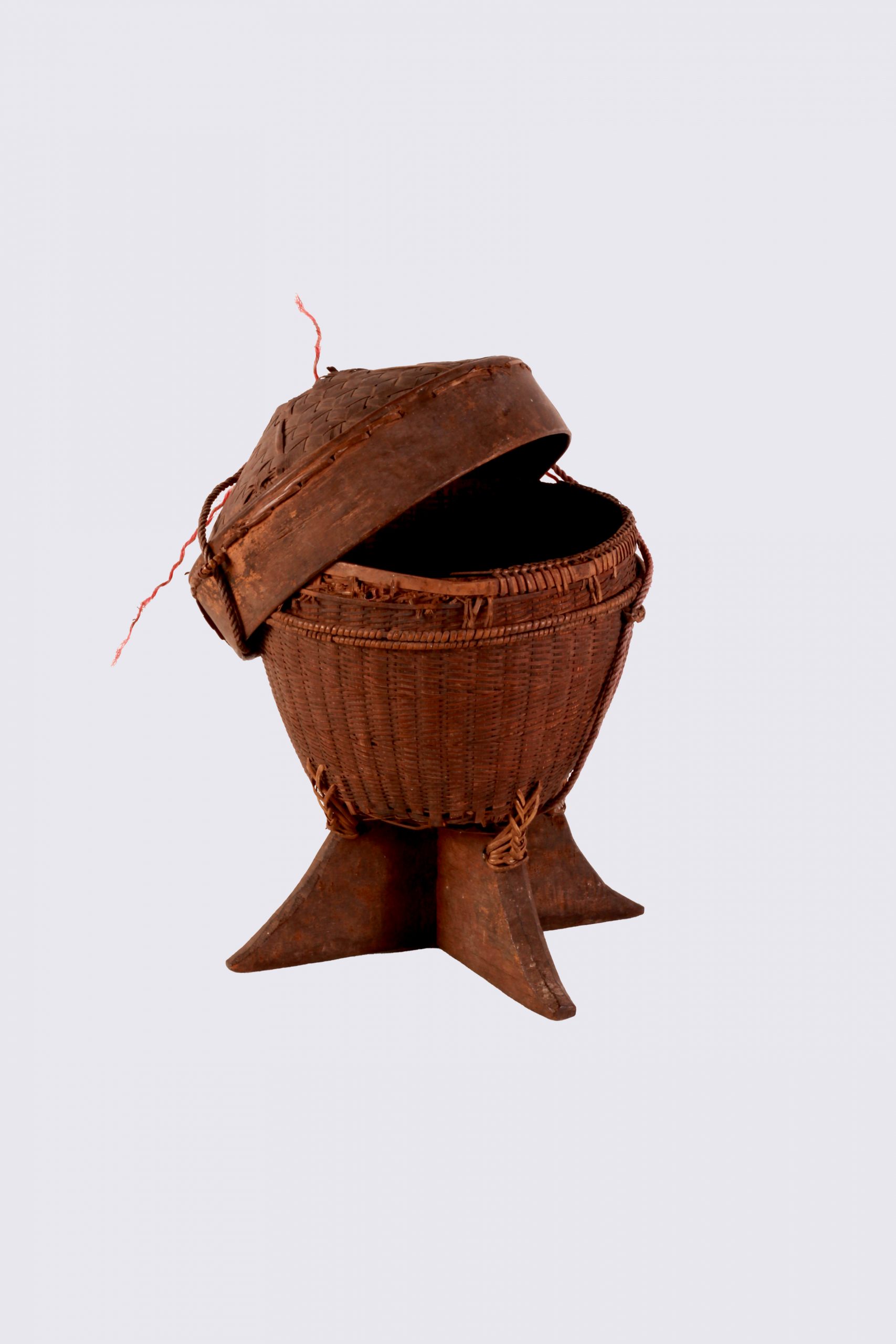 ก่องเข้า (งานจักสาน) OACH0114 ชื่อวัตถุ : ก่องเข้าแบบศิลปะ : หัตถกรรมจักสานลักษณะ : ภาชนะสำหรับข้าวเหนียวนึ่ง รูปร่างคล้ายโถทรงสูง มีฝาคล้ายฝาชี มักสานด้วยตอกปี้นเป็นลายเกล็ดเต่า มีขอบทำด้วยก้านตาล ตีนเป็นฐานทำด้วยไม้เบญจพรรณไขว้กันเป็นรูปกากบาทผายออกเล็กน้อย (วิบูลย์ ลี้สุวรรณ.2553. หน้า 84)สภาพ : ตัวก่องเข้าลายจูงนางที่ปากก่องขาดหลุดหายบางส่วน หูคล้องสายที่ก่องเข้าเส้นหวายหลุดหลวมบางจุด ส่วนฝาด้านข้างเป็นรอยหักช่องขนาดใหญ่ และยอดฝาฉีกขาดหายไปขนาด : ก่องเข้า กว้าง 17.7 cm (ฐาน) สูง 17.3 cm ฝาก่องเข้า เส้นรอบวง 43 cm สูง 8.7 cmชนิด : วัสดุไม้ไผ่ประวัติ : –สถานที่เก็บ : ห้องเก็บของในการจัดนิทรรศการ ชั้น 1 สำนักศิลปะและวัฒนธรรม มหาวิทยาลัยราชภัฏอุดรธานี เลขวัตถุ : OACH0114/2566 เลขภาพ : OACH0114(OACH0114_1 , OACH0114_2)ถ่ายเมื่อ : 8 พฤศจิกายน 2566