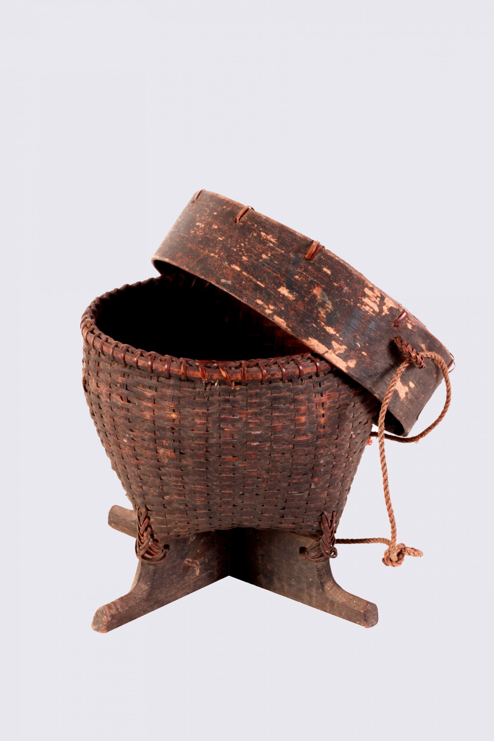 ก่องเข้า (งานจักสาน) OACH0116 ชื่อวัตถุ : ก่องเข้าแบบศิลปะ : หัตถกรรมจักสานลักษณะ : ภาชนะสำหรับข้าวเหนียวนึ่ง รูปร่างคล้ายโถทรงสูง มีฝาคล้ายฝาชีทรงแบน มักสานด้วยตอกปี้นเป็นลายเกล็ดเต่า มีขอบทำด้วยก้านตาล ตีนเป็นฐานทำด้วยไม้เบญจพรรณไขว้กันเป็นรูปกากบาทผายออกเล็กน้อย (วิบูลย์ ลี้สุวรรณ.2553. หน้า 84)สภาพ : สภาพรวมสมบูรณ์ มีรอยถลอกเล็กน้อยขนาด : ก่องเข้า กว้าง 19.4 cm (ฐาน) สูง 15.3 cm ฝาก่องเข้า เส้นรอบวง 53.2 cm สูง 4.8 cmชนิด : วัสดุไม้ไผ่ประวัติ : –สถานที่เก็บ : ห้องเก็บของในการจัดนิทรรศการ ชั้น 1 สำนักศิลปะและวัฒนธรรม เลขวัตถุ : OACH0116/2566 เลขภาพ : OACH0116 (OACH0116_1 , OACH0116_2)ถ่ายเมื่อ : 8 พฤศจิกายน 2566