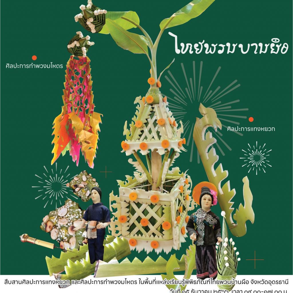 วันที่ 15 ธันวาคม 2566 สำนักศิลปะและวัฒนธรรมจัดกิจกรรมอบรมเชิงปฏิบัติการสืบสานศิลปะการแทงหยวก และการทำพวงมโหตร (พวงมาลัยอีสาน) ในพื้นที่แหล่งเรียนรู้พิพิธภัณฑ์ไทยพวนบ้านผือ จังหวัดอุดรธานี ภายใต้โครงการหน่วยอนุรักษ์สิ่งแวดล้อมธรรมชาติและศิลปกรรมท้องถิ่นจังหวัดอุดรธานี ประจำปีงบประมาณ พ.ศ. 2567 และเป็นกิจกรรมการจัดทำฐานข้อมูลศิลปะและวัฒนธรรมอีสาน (KM Action Plan) ศิลปวัฒนธรรมไทยพวนบ้านผือ