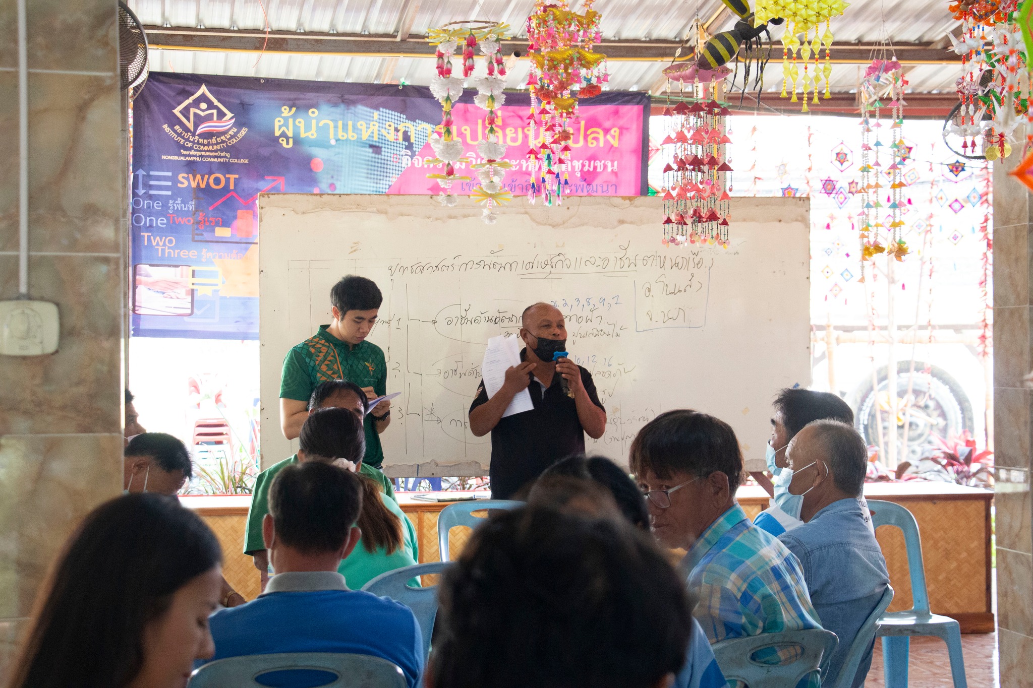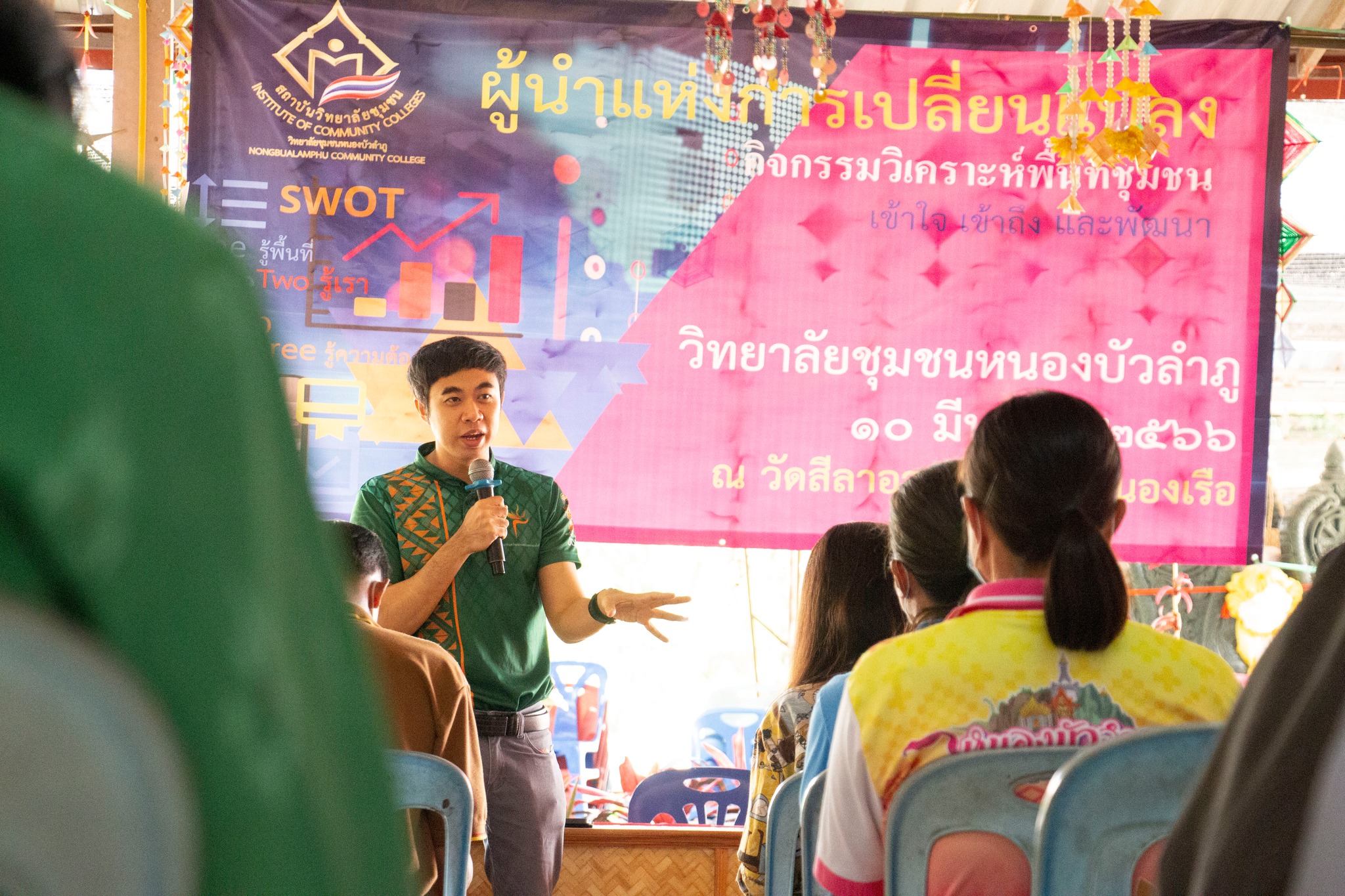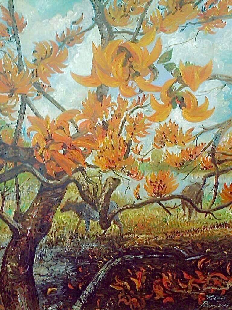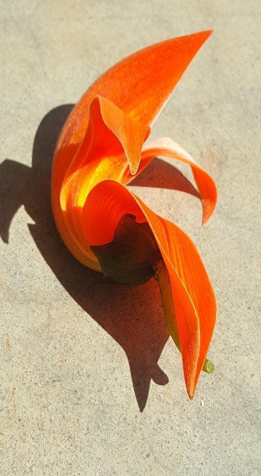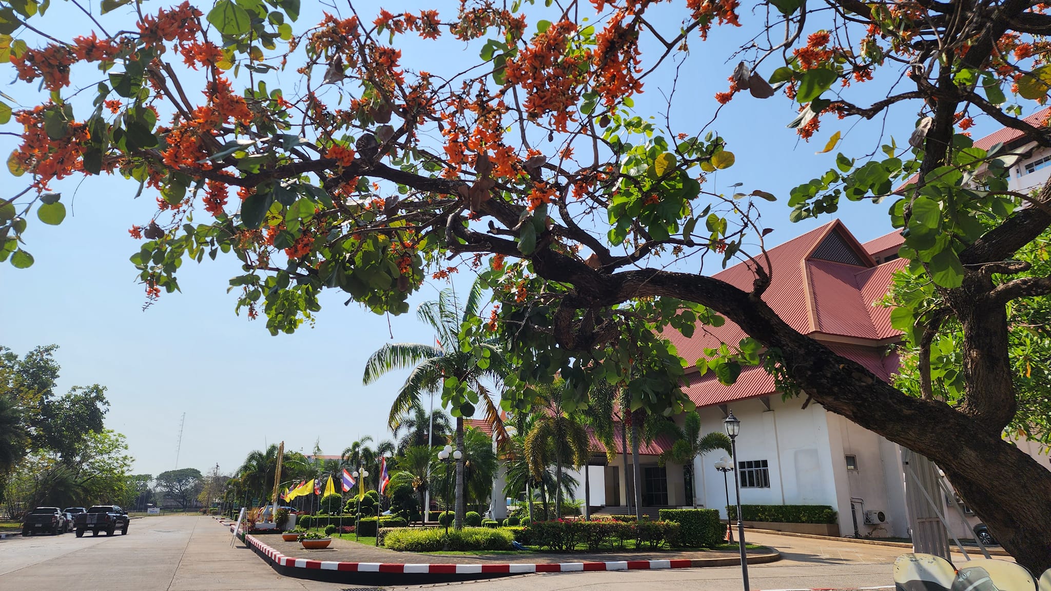 ดอกทองกวาว ออกดอกเป็นช่อคล้ายกับดอกทองหลาง ดอกมีสีแดงส้มหรือแสด มีความยาวประมาณ ๖-๑๕ เซนติเมตร มีดอกย่อยเกาะกันเป็นกลุ่ม เมื่อดอกบานจะมีกลีบ ๕ กลีบ และจะออกดอกมากในช่วงเดือนกุมภาพันธ์ของทุกปี