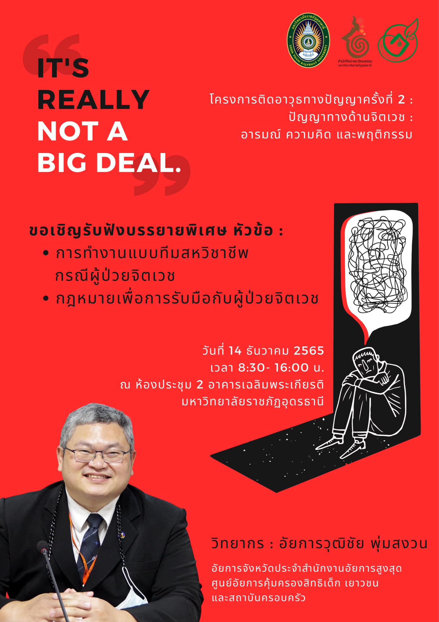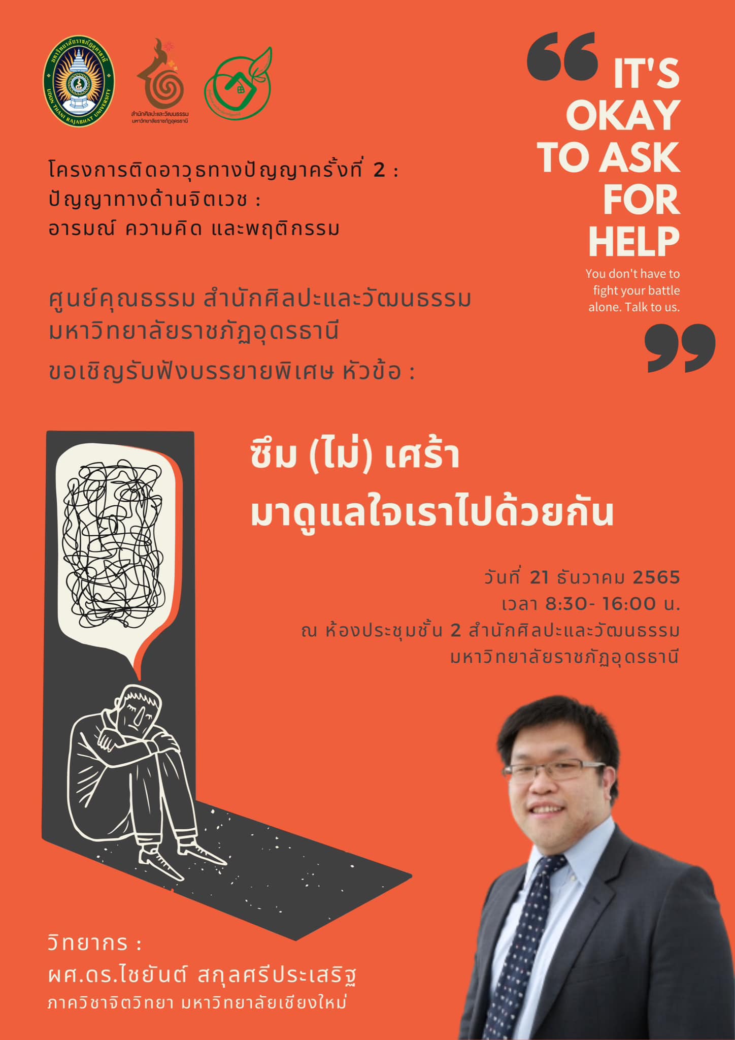 วันที่ 21 ธันวาคม 2565 ศูนย์คุณธรรม สำนักศิลปะและวัฒนธรรม มหาวิทยาลัยราชภัฏอุดรธานี จัด “โครงการเชิงปฏิบัติการติดอาวุธทางปัญญา ครั้งที่ 2 : ปัญญาทางด้านจิตเวช : อารมณ์ ความคิด และพฤติกรรม” โดยผู้ช่วยศาสตราจารย์ ดร.ไชยันต์ สกุลศรีประเสริฐ ภาควิชาจิตวิทยา มหาวิทยาลัยเชียงใหม่ วิทยากร ในหัวข้อ ซึม (ไม่) เศร้า มาดูแลใจเราไปด้วยกัน